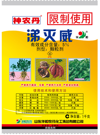 1.甘薯地使用:每畝2-3公斤,限畝栽2500-3000株地區(3000株以上,按每株1克)。施藥距采收安全間隔期150天。并嚴格遵守以下規定:(1)地下水位埋深1米以內,年降雨量大于1000毫米的沙土和沙壤地區,距水源100米以內的地塊不得使用。(2)該產品被作物根系吸收并發揮良好藥效所需要的最低土壤含水量為5%(重量比)。否則將影響藥效,為此,在常年5-6月份氣候干旱的丘陵半山區應采用深施藥法,即把藥顆粒施在薯秧入土的莖基部下邊約2-3厘米深處,并澆足水以減輕干旱對藥效的影響,利于藥效的正常發揮。(3)僅限在冀、魯、豫春甘薯莖線蟲發生嚴重的地區使用。(4)安全間隔期內施藥田設立警示牌:“不得采摘莖葉和挖甘薯塊食用或飼用,劇毒!”